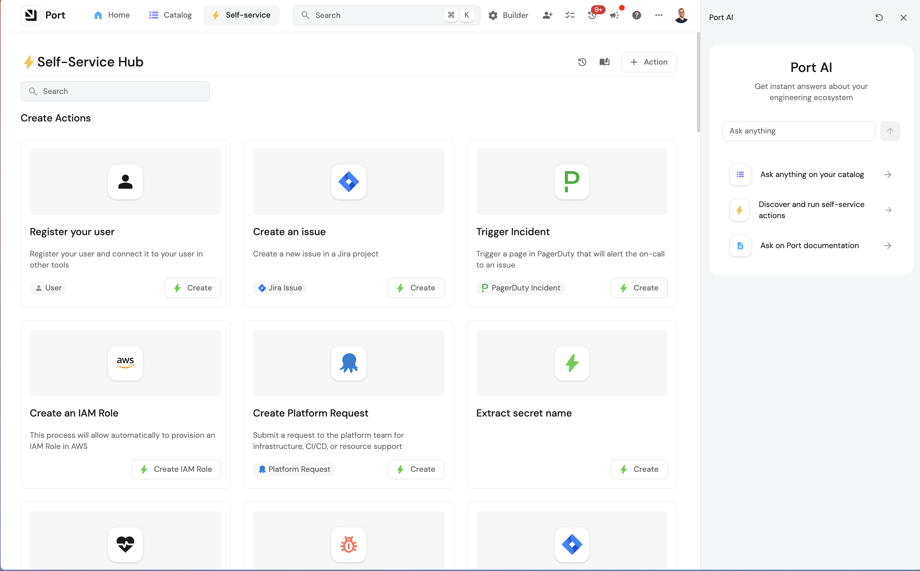 • Comprehensive knowledge: Understands your catalog, actions, and Port documentation.