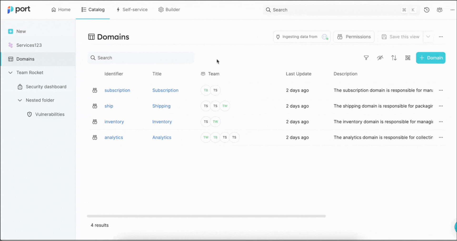 Port allows you to create folders in your software catalog that can be used to group pages by topic, team, or any other criteria that fits the needs of your organization.