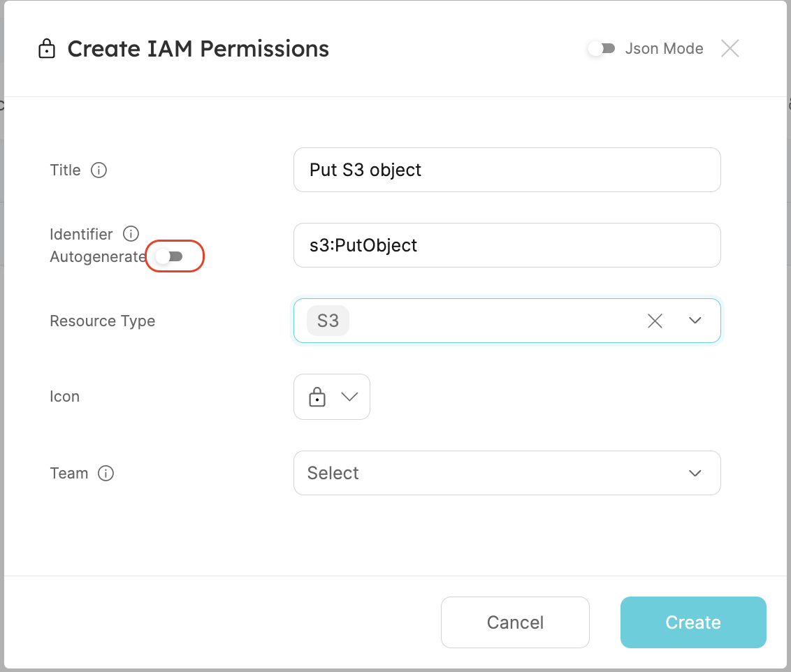 In the IAM Permissions catalog page, click Manually add IAM Permission or click the + IAM Permissions button to create an entity. The entity's identifier should be the IAM permission you want to allow (e.g., s3:PutObject). Ensure you toggle off the Autogenerate option for the identifier.