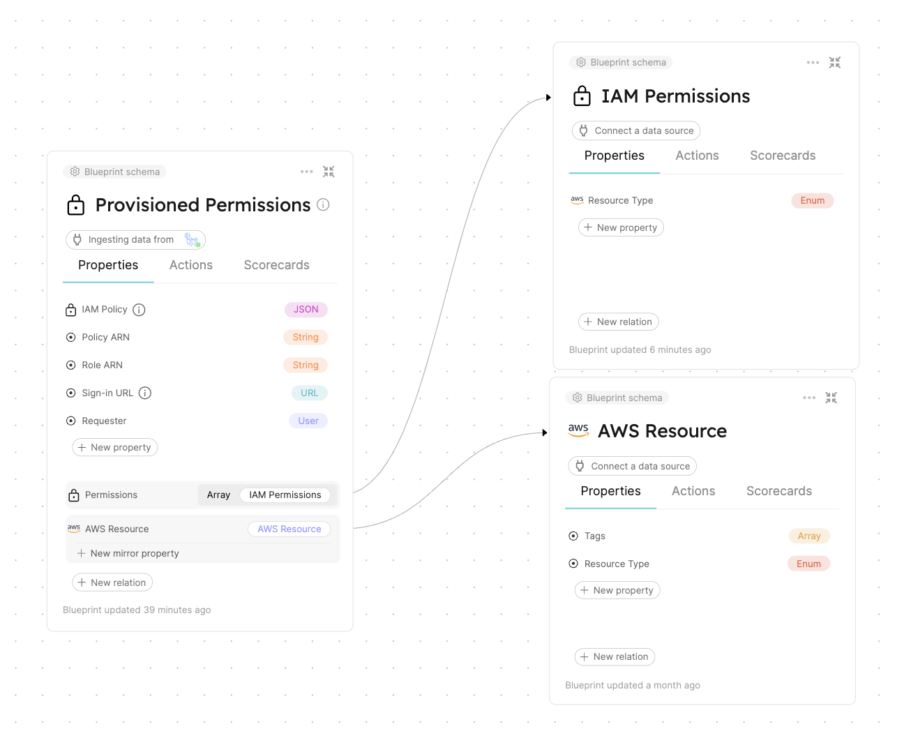 The entities of this blueprint represent different AWS IAM permissions that can be associated to an IAM Policy (s3:DeleteBucket, s3:PutObject, ec2:StopInstances, ec2:TerminateInstances, etc.).