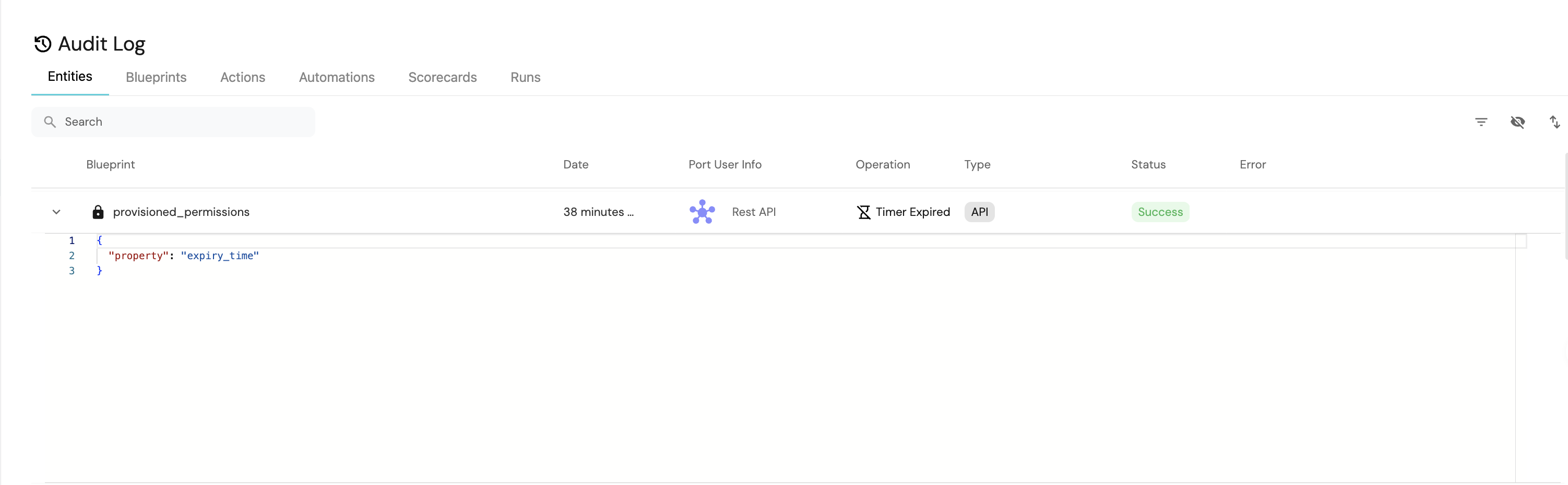 Next, click on the Builder button located at the top right. Then, navigate to the Audit Log tab on the left sidebar. After five minutes have elapsed, you should observe a Timer Expired event logged for a provisioned_permissions blueprint. This event is automatically generated by Port when the manually set expiry time for the Provisioned Permissions entity is reached.