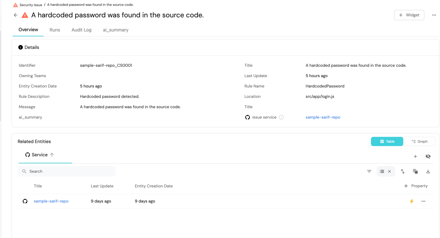 kind: filespecifies that the source is a file, in this case,.sariffiles.files:defines the path pattern to locate.sariffiles within your repositories.itemsToParse:processes the.sariffile content to extract security issues.identifier:constructs a unique identifier for each security issue by combining the repository name and the rule ID.properties:captures essential details like rule name, description, location, and message.relations:establishes a relation between the security issue and the corresponding service.