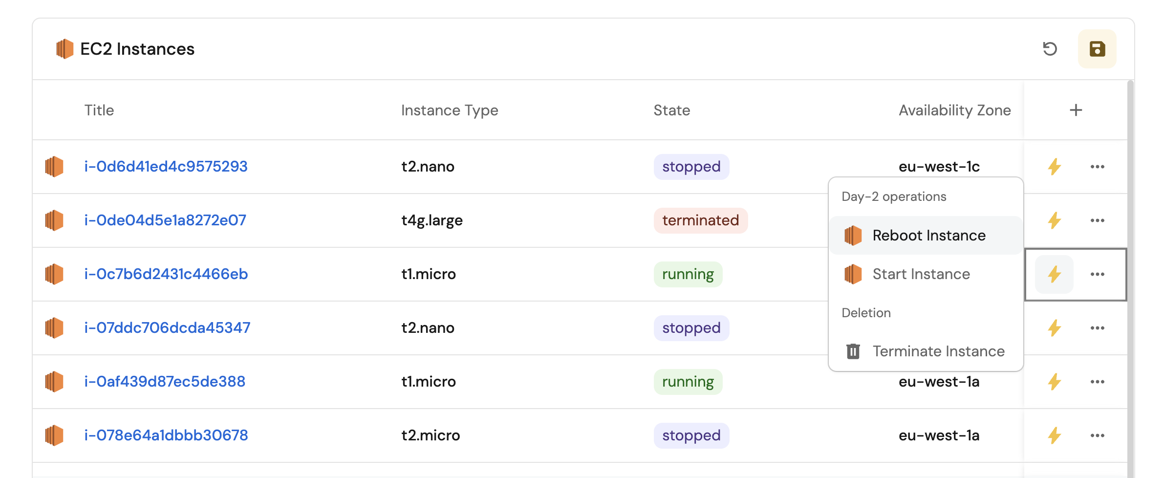 - Set up self-service actions to manage EC2 instances (start, reboot, and terminate).